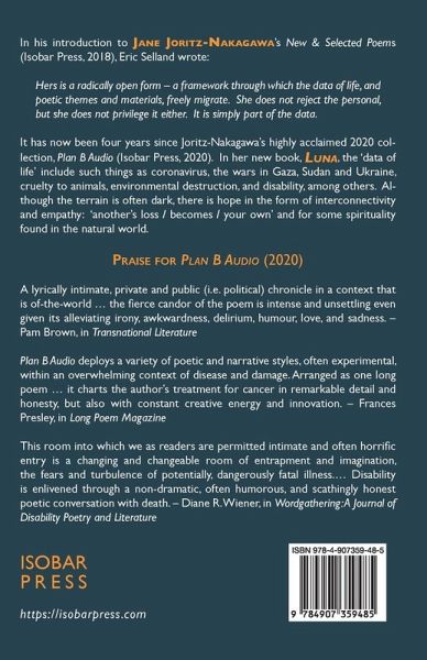 Eric Selland on Jane Joritz-Nakagawa: Hers is a radically open form - a framework through which the data of life, and poetic themes and materials, freely migrate. She does not reject the personal, but she does not privilege it either. It is simply part of the data. It has been four years since Joritz-Nakagawa's highly acclaimed 2020 collection, Plan B Audio (Isobar, 2020, including photography by Susan Laura Sullivan). In her new book, Luna, the "data of life" include such things as the coronavirus, the wars in Gaza, Sudan and Ukraine, cruelty to animals, environmental destruction, and disability, among others. Although the terrain is often dark, there is hope in the form of interconnectivity and empathy: "another's loss / becomes / your own" and for some spirituality found in the natural world.