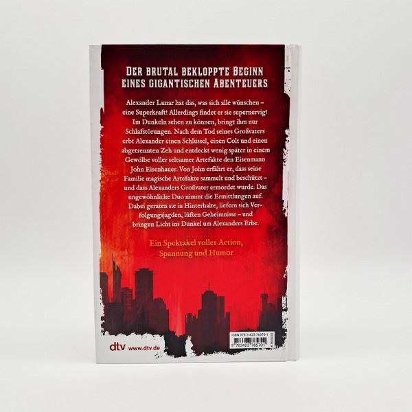 Alexander Lunar hat das, was sich alle wünschen - eine Superkraft! Allerdings findet er sie supernervig! Im Dunkeln sehen zu können, bringt ihm nur Schlafstörungen. Nach dem Tod seines Großvaters erbt Alexander einen Schlüssel, einen Colt und einen abgetrennten Zeh und entdeckt wenig später in einem Gewölbe voller seltsamer Artefakte den Eisenmann John Eisenhauer. Von John erfährt er, dass seine Familie magische Artefakte sammelt und beschützt - und dass Alexanders Großvater ermordet wurde. Das ungewöhnliche Duo nimmt die Ermittlungen auf. Dabei geraten sie in Hinterhalte, liefern sich halsbrecherische Verfolgungsjagden, lüften so manches Geheimnis - und bringen Licht ins Dunkel um Alexanders Erbe.