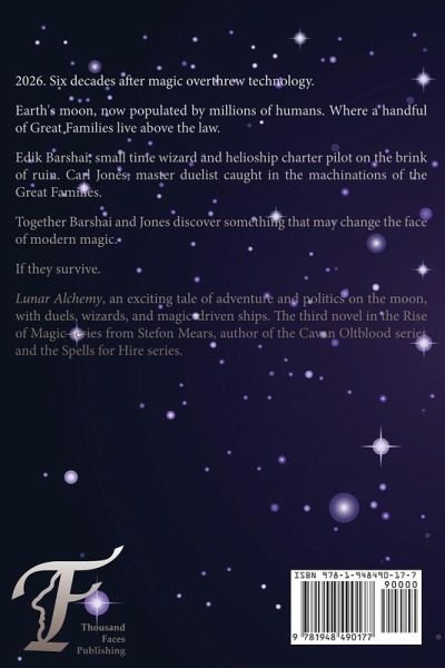 2026. Six decades after magic overthrew technology. Earth's moon, now populated by millions of humans. Where a handful of Great Families live above the law. Edik Barshai, small time wizard and helioship charter pilot on the brink of ruin. Carl Jones, master duelist caught in the machinations of the Great Families. Together Barshai and Jones discover something that may change the face of modern magic. If they survive. Lunar Alchemy, an exciting tale of adventure and politics on the moon, with duels, wizards, and magic-driven ships. The third novel in the Rise of Magic series from Stefon Mears, author of the Cavan Oltblood series and the Spells for Hire series.