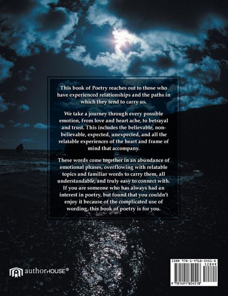 This book of Poetry reaches out to those who have experienced relationships and the paths in which they tend to carry us. We take a journey through every possible emotion, from love and heart ache, to betrayal, and trust. This includes the believable, non-believable, expected, unexpected, and all the relatable experiences of the heart and frame of mind, that accompany. These words come together in an abundance of emotional phases, overflowing with relatable topics and familiar words to carry them, all understandable, and truly easy to connect with. If you are someone who has always had an interest in poetry, but found that you couldn't enjoy it because of the complicated use of wording, This book of poetry is for you.