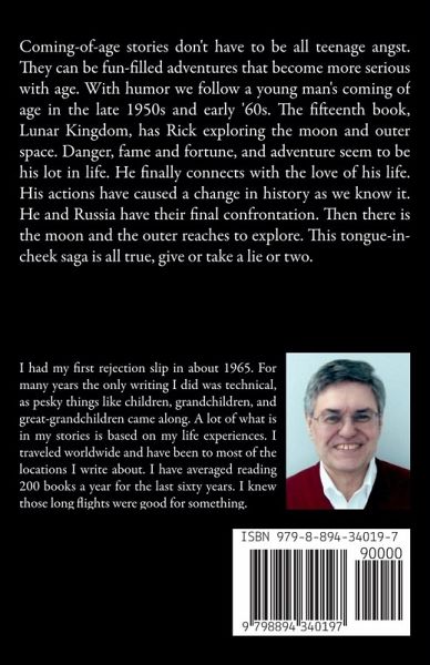 Coming-of-age stories don't have to be all teenage angst. They can be fun-filled adventures that become more serious with age. With humor,we follow a young man's coming of age in the late 1950s and early '60s. Starting in the summer before his freshman year, he goes through high school and beyond. He finds wealth as an inventor and fame in Hollywood as he searches for a girlfriend. Wealth and fame prove far easier than girls. The fifteenth book in the series, Lunar Kingdom, has Rick exploring the moon and outer space. Danger, fame and fortune, and adventure seem to be his lot in life. He finally connects with the love of his life. His actions have caused a change in history as we know it. He and Russia have their final confrontation. Then there is the moon and the outer reaches to explore. This tongue-in-cheek saga is all true, give or take a lie or two.