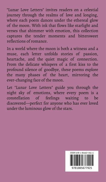 "Lunar Love Letters" invites readers on a celestial journey through the realms of love and longing, where each poem dances under the ethereal glow of the moon. With ink that flows like starlight and verses that shimmer with emotion, this collection captures the tender moments and bittersweet reflections of romance. In a world where the moon is both a witness and a muse, each letter unfolds stories of passion, heartache, and the quiet magic of connection. From the delicate whispers of a first kiss to the profound silence of goodbye, these poems explore the many phases of the heart, mirroring the ever-changing face of the moon. Let "Lunar Love Letters" guide you through the night sky of emotions, where every poem is a constellation of feelings waiting to be discovered-perfect for anyone who has ever loved under the luminous glow of the stars.