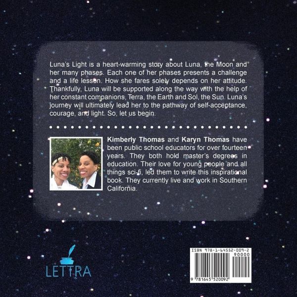 Luna's Light is a heart-warming story about Luna, the Moon and her many phases. Each one of her phases presents a challenge and a life lesson. How she fares solely depends on her attitude. Thankfully, Luna will be supported along the way with the help of her constant companions, Terra, the Earth and Sol, the Sun. Luna's journey will ultimately lead her to the pathway of self-acceptance, courage, and light. So, let us begin.
