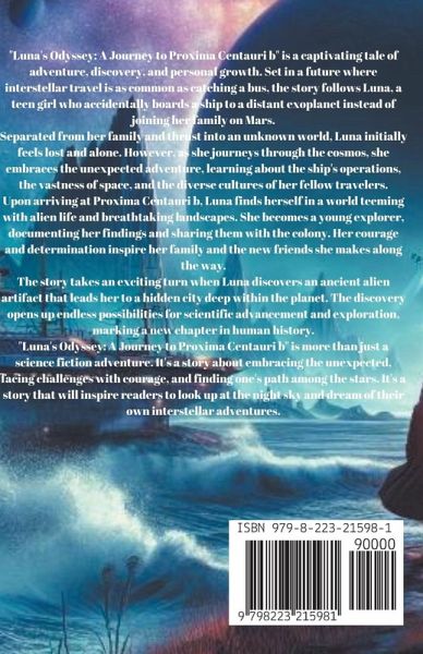 "Luna's Odyssey: A Journey to Proxima Centauri b" is a captivating tale of adventure, discovery, and personal growth. Set in a future where interstellar travel is as common as catching a bus, the story follows Luna, a teen girl who accidentally boards a ship to a distant exoplanet instead of joining her family on Mars. Separated from her family and thrust into an unknown world, Luna initially feels lost and alone. However, as she journeys through the cosmos, she embraces the unexpected adventure, learning about the ship's operations, the vastness of space, and the diverse cultures of her fellow travelers. Upon arriving at Proxima Centauri b, Luna finds herself in a world teeming with alien life and breathtaking landscapes. She becomes a young explorer, documenting her findings and sharing them with the colony. Her courage and determination inspire her family and the new friends she makes along the way. The story takes an exciting turn when Luna discovers an ancient alien artifact that leads her to a hidden city deep within the planet. The discovery opens up endless possibilities for scientific advancement and exploration, marking a new chapter in human history. "Luna's Odyssey: A Journey to Proxima Centauri b" is more than just a science fiction adventure. It's a story about embracing the unexpected, facing challenges with courage, and finding one's path among the stars. It's a story that will inspire readers to look up at the night sky and dream of their own interstellar adventures.
