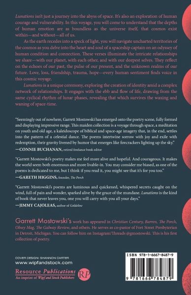 Lunations isn't just a journey into the abyss of space. It's also an exploration of human courage and vulnerability. In this voyage, you will come to understand that the depths of human emotion are as boundless as the universe itself, that cosmos exist within--and without--all of us. As the earth recedes into a speck of light, you will navigate uncharted territories of the cosmos as you delve into the heart and soul of a spaceship captain on an odyssey of human condition and connection. These verses illuminate the intricate relationships we share--with our planet, with each other, and with our deepest selves. They reflect on the echoes of our past, the pulse of our present, and the unknown realms of our future. Love, loss, friendship, trauma, hope--every human sentiment finds voice in this cosmic voyage. Lunations is a unique ceremony, exploring the creation of identity amid a complex network of relationships. It engages with the ebb and flow of life, drawing from the same cyclical rhythm of lunar phases, revealing that which survives the waxing and waning of space-time.