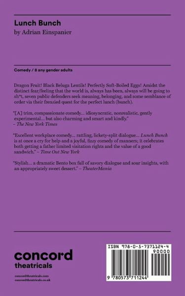 Dragon Fruit! Black Beluga Lentils! Perfectly Soft-Boiled Eggs! Amidst the distinct fear/feeling that the world is, always has been, always will be going to sh*t, seven public defenders seek meaning, belonging, and some semblance of order via their frenzied quest for the perfect lunch (bunch). "[A] trim, compassionate comedy... idiosyncratic, nonrealistic, gently experimental... but also charming and smart and kindly." - The New York Times "Excellent workplace comedy... rattling, lickety-split dialogue... Lunch Bunch is at once a cry for help and a joyful, fizzy comedy of manners; it celebrates both getting a father limited visitation rights and the value of a good sandwich." - Time Out New York "Stylish... a dramatic Bento box full of savory dialogue and sour insights, with an appropriately sweet dessert." - TheaterMania