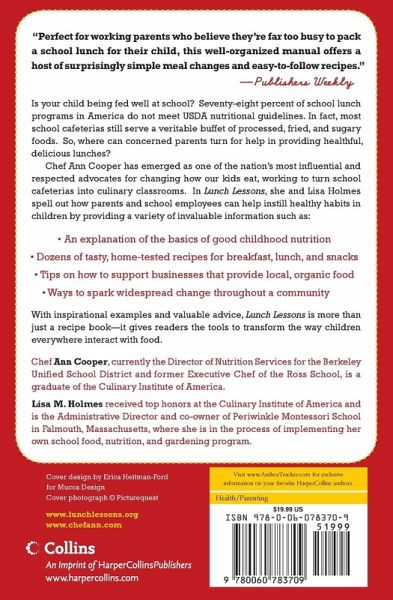 Remember how simple school lunches used to be? You'd have something from every major food group, run around the playground for a while, and you looked and felt fine. But today it's not so simple. Schools are actually feeding the American crisis of childhood obesity and malnutrition. Most cafeterias serve a veritable buffet of processed, fried, and sugary foods, and although many schools have attempted to improve, they are still not measuring up: 78 percent of the school lunch programs in America do not meet the USDA's nutritional guidelines. Chef Ann Cooper has emerged as one of the nation's most influential and most respected advocates for changing how our kids eat. In fact, she is something of a renegade lunch lady, minus the hairnet and scooper of mashed potatoes. Ann has worked to transform cafeterias into culinary classrooms. In Lunch Lessons, she and Lisa Holmes spell out how parents and school employees can help instill healthy habits in children. They explain the basics of good childhood nutrition and suggest dozens of tasty, home-tested recipes for breakfast, lunch, and snacks. The pages are also packed with recommendations on how to eliminate potential hazards from the home, bring gardening and composting into daily life, and how to support businesses that provide local, organic food. Yet learning about nutrition and changing the way you run your home will not cure the plague of obesity and poor health for this generation of children. Only parental activism can spark widespread change. With inspirational examples and analysis, Lunch Lessons is more than just a recipe book¿it gives readers the tools to transform the way children everywhere interact with food.