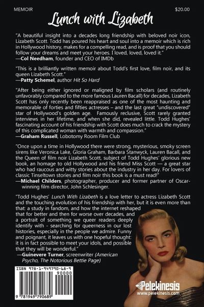 Lizabeth Scott reigned in Hollywood as the queen of film noir. By the time obsessed fan and gay filmmaker Todd Hughes sat down to lunch with her at Musso & Frank in Hollywood, she had largely outlived her fame. The two of them formed a unique bond and an enduring friendship that spanned twenty years. One of the very last vestiges of Hollywood's Golden Age, Lizabeth reveals to Hughes her ebullient personality and zest for life while shedding insight into her fabulously brief career as an international film star, recording artist and mistress to one of Hollywood's biggest producers. They stumble over homosexuality, art and politics but always manage to find a way to navigate the turn of the century.