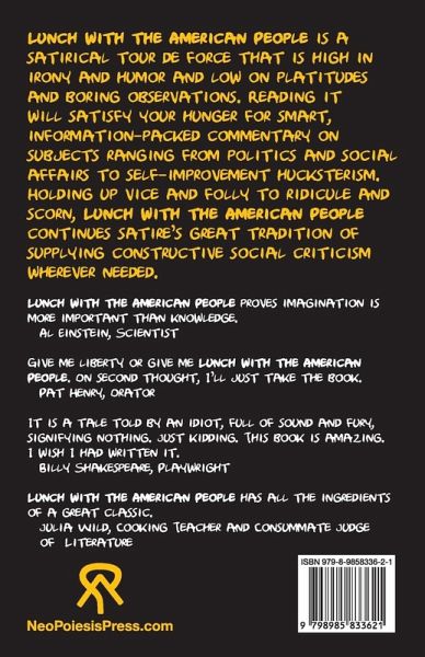 Lunch with the American People is a satirical tour de force that is high in irony and humor and low on platitudes and boring observations. Reading it will satisfy your hunger for smart, information-packed commentary on subjects ranging from politics and social affairs to self-improvement hucksterism. Holding up vice and folly to ridicule and scorn, Lunch with the American People continues satire's great tradition of supplying constructive social criticism wherever needed.