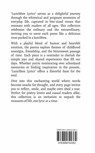 "Lunchbox Lyrics" serves as a delightful journey through the whimsical and poignant moments of everyday life, captured in bite-sized verses that resonate with readers of all ages. This collection celebrates the ordinary and the extraordinary, inviting you to savor each poem like a delicious treat packed in a lunchbox. With a playful blend of humor and heartfelt emotion, the poems explore themes of childhood nostalgia, friendship, and the bittersweet passage of time. Each piece is a reminder to cherish the simple joys and shared experiences that fill our days. Whether you're reminiscing over schoolyard memories or finding inspiration in the present, "Lunchbox Lyrics" offers a flavorful feast for the soul. Dive into this enchanting world where words become snacks for thought, and every page invites you to reflect, smile, and maybe even shed a tear. Perfect for poetry lovers and casual readers alike, this collection is an invitation to unpack the treasures of life, one lyric at a time.