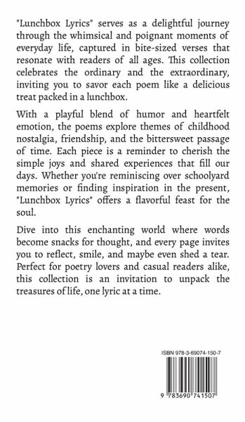 "Lunchbox Lyrics" serves as a delightful journey through the whimsical and poignant moments of everyday life, captured in bite-sized verses that resonate with readers of all ages. This collection celebrates the ordinary and the extraordinary, inviting you to savor each poem like a delicious treat packed in a lunchbox. With a playful blend of humor and heartfelt emotion, the poems explore themes of childhood nostalgia, friendship, and the bittersweet passage of time. Each piece is a reminder to cherish the simple joys and shared experiences that fill our days. Whether you're reminiscing over schoolyard memories or finding inspiration in the present, "Lunchbox Lyrics" offers a flavorful feast for the soul. Dive into this enchanting world where words become snacks for thought, and every page invites you to reflect, smile, and maybe even shed a tear. Perfect for poetry lovers and casual readers alike, this collection is an invitation to unpack the treasures of life, one lyric at a time.