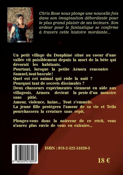 Un petit village du Dauphiné situé au coeur d'une vallée vit paisiblement depuis plusieurs années. Le souvenir de l'animal qui dévorait les habitants s'est estompé. Pourtant, lorsque la petite Aénora rencontre Samuel, tout bascule !Quelle est cette bête qui rôde dans la nuit ? Pourquoi tant de secrets dissimulés ? Deux chasseurs assermentés viennent en aide aux villageois.Aénora devient la proie d'un monstre sans pitié.Amour, violence, haine, tout s'emmêle !La jeune fille fera tout pour l'amour de sa vie.Teïlo pourchassera la créature sans répit.Plongez-vous dans la noirceur de cette histoire et vous n'aurez plus envie de vous en extraire...