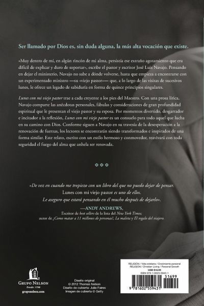 '¿Quà nombre dio el doctor a esto que a mà me ocurreâ sà ndrome burnout?' Un joven pastor, profundamente abatido, piensa en abandonar el ministerio; un anciano de ochenta y tres aà os sirvià a Dios toda su vida; los dos están entrelazados durante sucesivos lunes que marcarán la vida del joven para siempre.