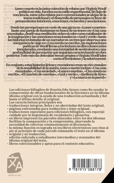 Lunes o martes es la única colección de relatos que Virginia Woolf publicó en vida. Escritos en su estilo experimental, de flujo de conciencia, estos ocho relatos poco convencionales se alejan de la trama tradicional y el desarrollo de personajes en favor de pensamientos interiores, emociones, recuerdos y asociaciones. Desde las percepciones en vuelo de una garza en Lunes o martes hasta una pareja de fantasmas en busca de un tesoro en Una casa encantada, desde una meditación sobre el color como catalizador de la imaginación y las conexiones emocionales en Azul y verde hasta las historias inventadas de un narrador en un tren que observa a una compañera de viaje en Una novela no escrita, las exploraciones poéticas de Woolf llevan a los lectores en direcciones antes inexploradas, revelando una intensidad de sentimientos y una profundidad de percepción que seguirían caracterizando su obra posterior. Todo esto sin descuidar temas propios a Virginia Woolf tales como el feminismo y la salud mental. En conjunto, estas historias líricas y evocadoras crean un rico mosaico de la sensibilidad de la autora. Lunes o martes incluye Una casa encantada, Una sociedad, Lunes o martes, Una novela no escrita, El cuarteto de cuerdas, Azul y verde, Jardines de Kew y La marca en la pared. Esta nueva traducción al español permite la lectura en un lenguaje actualizado y ameno, haciendo justicia al original.