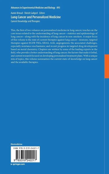 1 Lung Cancer Statistics.- 2 Epidemiology of Lung Cancer.- 3 Lung Cancer In Never Smokers.- 4 Immune Therapy.- 5 Anti-angiogenesis in personalized therapy of lung cancer.- 6 Target therapy in Lung Cancer.- 7 Mechanisms of Resistance to EGFR Tyrosine Kinase Inhibitors and Therapeutic Approaches: an update.- 8 KRAS-Mutant Lung Cancers in the Era of Targeted Therapy.- 9 Anaplastic Lymphoma Kinase (ALK) Signaling in Lung Cancer.- 10 Chemotherapy Resistance in Lung Cancer.- 11 Current state of metal-based drugs for the efficient therapy of lung cancers and lung metastases.