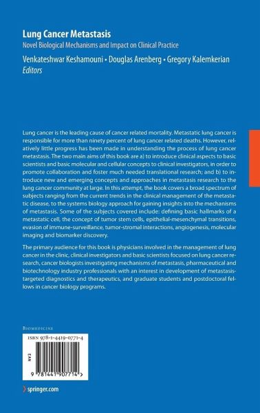 Lung cancer is the leading cause of cancer-related mortality. Metastatic lung cancer is responsible for more than ninety percent of lung cancer related deaths. However, relatively little progress has been made in understanding the process of lung cancer metastasis. The two main aims of this book are a) to introduce clinical aspects to basic scientists and basic molecular and cellular concepts to clinical investigators, in order to promote collaboration and foster much needed translational research; and b) to introduce new and emerging concepts and approaches in metastasis research to lung cancer research community at large.