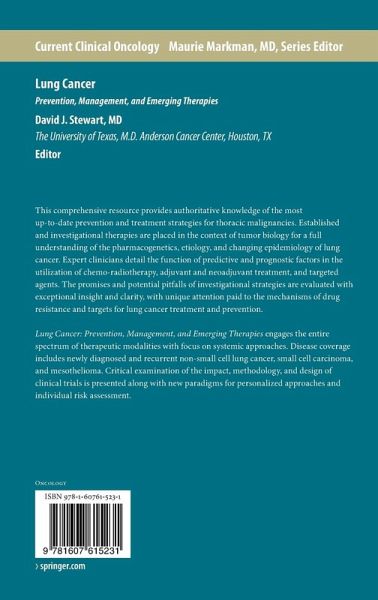 "This comprehensive review of prevention and treatment strategies for malignancies of the thorax thoroughly investigates tumor biology and discusses established and emerging therapies. ... The book is written for a wide audience that includes pathologists, pulmonologists, medical oncologists, radiation oncologists, and surgical oncologists. ... I would highly recommend this book to anyone interested in current and future therapies for lung cancer. This is one of the most comprehensive and up-to-date accounts of the field." (Nagendra S. Koneru, Doody's Review Service, July, 2010)
