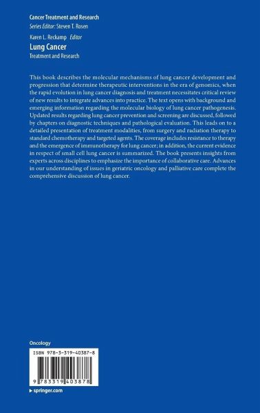 This book describes the molecular mechanisms of lung cancer development and progression that determine therapeutic interventions in the era of genomics, when the rapid evolution in lung cancer diagnosis and treatment necessitates critical review of new results to integrate advances into practice. The text opens with background and emerging information regarding the molecular biology of lung cancer pathogenesis. Updated results regarding lung cancer prevention and screening are discussed, followed by chapters on diagnostic techniques and pathological evaluation. This leads on to a detailed presentation of treatment modalities, from surgery and radiation therapy to standard chemotherapy and targeted agents. The coverage includes resistance to therapy and the emergence of immunotherapy for lung cancer; in addition, the current evidence in respect of small cell lung cancer is summarized. The book presents insights from experts across disciplines to emphasize the importance ofcollaborative care. Advances in our understanding of issues in geriatric oncology and palliative care complete the comprehensive discussion of lung cancer.