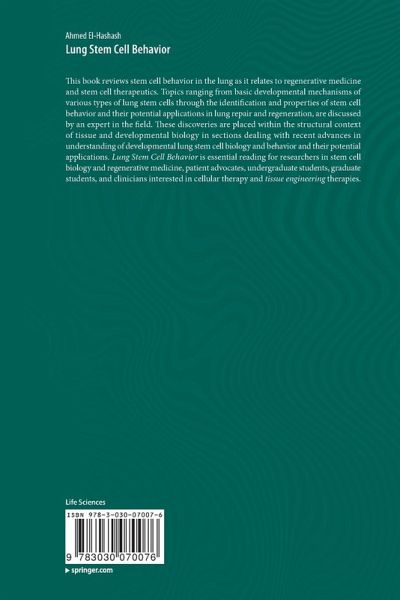 This book reviews stem cell behavior in the lung as it relates to regenerative medicine and stem cell therapeutics. Topics ranging from basic developmental mechanisms of various types of lung stem cells through the identification and properties of stem cell behavior and their potential applications in lung repair and regeneration, are discussed by an expert in the field. These discoveries are placed within the structural context of tissue and developmental biology in sections dealing with recent advances in understanding of developmental lung stem cell biology and behavior and their potential…mehr