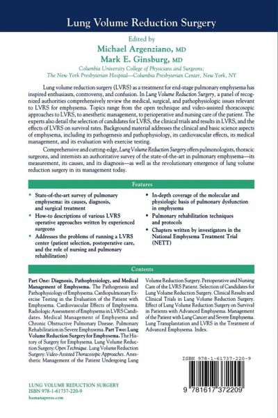 Comprehensive and cutting-edge, Lung Volume Reduction Surgery offers pulmonologists, thoracic surgeons, and internists an authoritative survey of the state-of-the-art in pulmonary emphysema-its measurement, its causes, and its diagnosis-as well as the revolutionary emergence of lung volume reduction surgery and its management today.