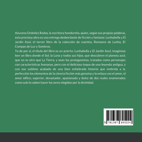 Azucena Ordoñez Rodas, la escritora hondureña, quien, según sus propias palabras, esta preciosa obra es una entrega desbordante de ficción y fantasía: Lunhabella y El Jardín Azul, el tercer libro de la colección de cuentos, Romance de Lunha, El Compas de Luz y Sombras. Ya de por sí, el título del libro es un acierto: Lunhabella y El Jardín Azul, imagínese leer un libro donde el Sol, la Luna y todos sus hijos, que descubren el planeta azul, que no es otro que La Tierra, y sean los protagonistas, tratados como personajes con características humanas, pero con el delicioso toque de una leyenda antigua, y con ese sublime acabado de una bien enhebrada historia que embrida a la perfección los elementos de la ciencia ficción más genuina y la enlaza con el amor, el amor idílico, superior, devastador, apasionado y dulce de dos reales enamorados como solo lo saben hacer los seres elegidos por la divinidad.