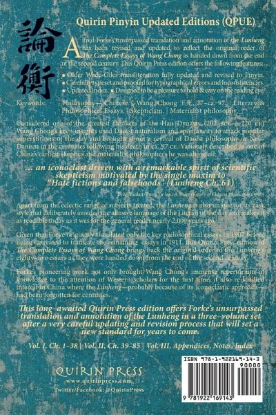 A Quirin Pinyin Updated Editions (QPUE) Alfred Forke's unsurpassed translation and annotation of the Lunheng ¿¿ has been revised and updated to reflect the original order of The Complete Essays of Wang Chong ¿¿, 27-ca. 97. as handed down from the end of the second century. This Quirin Press edition offers the following features: ¿ Older Wade-Giles transliteration fully updated and revised to Pinyin. ¿ Carefully typeset and proofed for typographical errors and inconsistencies. ¿ Updated index. ¿ Designed to be a pleasure to hold & easy on the reading eye. Keywords: Philosophy- Chinese. Wang, Chong ¿¿, 27-ca. 97. Literary & Philosophical Essays Skepticism Materialist philosophy. Considered one of the greatest thinkers of the Han Dynasty (202 BCE - 220 CE) Wang Chong's keen insights used Daoist naturalism and spontaneity to attack popular superstitions of the day and brought about a revival of Daoist philosophy or Neo-Daoism in the centuries following his death in ca. 97 CE. Variously described as one of China's earliest skeptics and materialist philosophers he was above all: ... an iconoclast driven with a remarkable spirit of scientific skepticism motivated by the single maxim to "Hate fictions and falsehoods" (Lunheng Ch. 61) Feng Youlan (Fung Yu-lan) A Short History of Chinese Philosophy (1960) Apart from the eclectic range of subjects treated, the Lunheng is also unique for its easy style that deliberately avoided the allusive language of the Literati of the day and makes it as readable today as it was for the general reader nearly 2,000 years ago. Given that Forke originally translated only the key philosophical essays in 1907 before being entreated to translate the remaining essays in 1911, this Quirin Press edition of The Complete Essays of Wang Chong brings back the original order of the Lunheng's eighty-five essays as they were handed down from the end of the second century. Forke's pioneering work not only brought Wang Chong's immense repertorium of knowledge to the attention of Western scholars for the first time, it also re-kindled interest in China where the Lunheng-probably because of its iconoclastic approach- had been forgotten for centuries. This long-awaited Quirin Press edition offers Forke's unsurpassed translation and annotation of the Lunheng in a three-volume set after a very careful updating and revision process that will set a new standard for years to come. Vol. I, Ch. 1-38 Vol. II, Ch. 39-85 Vol. III, Appendices, Notes, Index Quirin Press www.quirinpress.com Twitter/Facebook: @QuirinPress