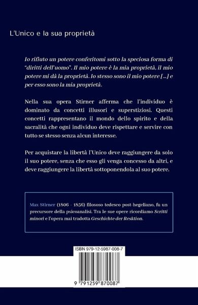 Nella sua opera Stirner afferma che l'individuo è dominato da concetti illusori e superstiziosi. Questi concetti rappresentano il mondo dello spirito e della sacralità che ogni individuo deve rispettare e servire con tutto se stesso senza alcun interesse. L'uomo non ha bisogno di Dio, perché egli solo è Dio di se stesso. Il suo interesse deve essere rivolto al suo "esclusivo" benessere. Per acquistare la libertà l'Unico deve raggiungere da solo il suo potere, senza che esso gli venga concesso da altri, sia persone sia enti quali lo Stato. Questo non significa che l'Unico debba realizzare l'ideale di libertà, sotto cui altrimenti sarebbe ancora schiavo; egli deve invece raggiungere la libertà sottoponendola al suo potere.