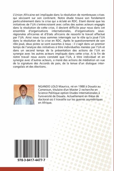 L'Union Africaine est impliquée dans la résolution de nombreuses crises qui sévissent sur son continent. Notre étude trouve son fondement particulièrement dans la crise qui a éclaté en RDC. Etant donné que les initiatives de l'UA s'entrecroisent avec celles des autres acteurs engagés dans la résolution de cette crise, il devient difficile pour nous dans cet ensemble d'organisations internationales, d'organisations sous-régionales africaines et d'Etats africains de ressortir le travail effectué par l'UA. Ainsi nous nous sommes interrogés sur le rôle qu'a joué l'UA dans la résolution de la crise en RDC. Après le questionnement de son rôle joué, deux pistes se sont ouvertes à nous : il s'agit dans un premier temps de l'analyse des initiatives à titre individuelles menées par l'UA et dans un second temps de la présentation des actions de l'UA en synergie avec les autres acteurs impliqués dans cette crise. A la fin de notre travail nous avons constaté que l'UA, à titre individuel et en synergie avec d'autres acteurs, a mené des actions de médiation en vue de la signature des Accords de paix, de la tenue d'un dialogue inter-congolais et des élections.