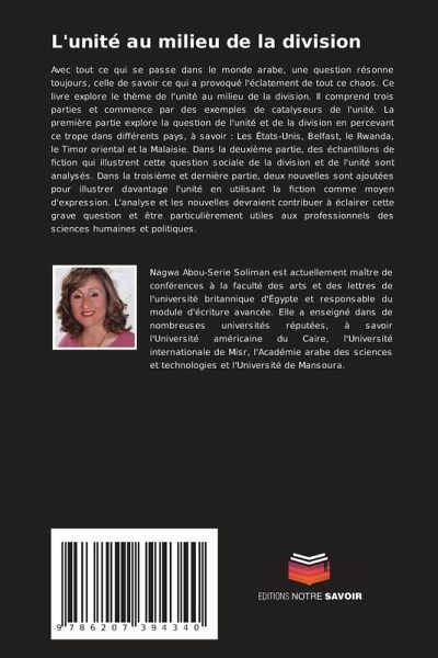 Avec tout ce qui se passe dans le monde arabe, une question résonne toujours, celle de savoir ce qui a provoqué l'éclatement de tout ce chaos. Ce livre explore le thème de l'unité au milieu de la division. Il comprend trois parties et commence par des exemples de catalyseurs de l'unité. La première partie explore la question de l'unité et de la division en percevant ce trope dans différents pays, à savoir : Les États-Unis, Belfast, le Rwanda, le Timor oriental et la Malaisie. Dans la deuxième partie, des échantillons de fiction qui illustrent cette question sociale de la division et de l'unité sont analysés. Dans la troisième et dernière partie, deux nouvelles sont ajoutées pour illustrer davantage l'unité en utilisant la fiction comme moyen d'expression. L'analyse et les nouvelles devraient contribuer à éclairer cette grave question et être particulièrement utiles aux professionnels des sciences humaines et politiques.