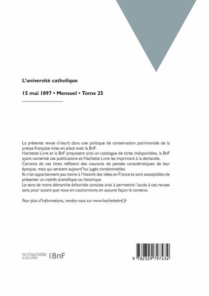 L'Université catholique: antérieurement "La Controverse et Le Contemporain" revue mensuelle publiée sous la direction d'un comité de professeurs des Facultés catholiques de Lyon avec le concours de nombreux savants et écrivains Date de l'édition originale: 1897-05-15 La présente revue s'inscrit dans une politique de conservation patrimoniale de la presse française mise en place avec la BnF. Hachette Livre et la BnF proposent ainsi un catalogue de titres indisponibles, la BnF ayant numérisé ces publications et Hachette Livre les imprimant à la demande. Certains de ces titres reflètent des courants de pensée caractéristiques de leur époque, mais qui seraient aujourd'hui jugés condamnables. Ils n'en appartiennent pas moins à l'histoire des idées en France et sont susceptibles de présenter un intérêt scientifique ou historique. Le sens de notre démarche éditoriale consiste ainsi à permettre l'accès à ces revues sans pour autant que nous en cautionnions en aucune façon le contenu. Pour plus d'informations, rendez-vous sur www.hachettebnf.fr
