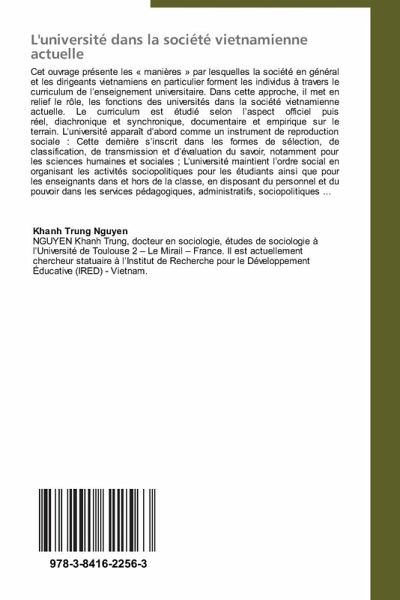 Cet ouvrage présente les " manières " par lesquelles la société en général et les dirigeants vietnamiens en particulier forment les individus à travers le curriculum de l enseignement universitaire. Dans cette approche, il met en relief le rôle, les fonctions des universités dans la société vietnamienne actuelle. Le curriculum est étudié selon l aspect officiel puis réel, diachronique et synchronique, documentaire et empirique sur le terrain. L université apparaît d abord comme un instrument de reproduction sociale : Cette dernière s inscrit dans les formes de sélection, de classification, de transmission et d évaluation du savoir, notamment pour les sciences humaines et sociales ; L université maintient l ordre social en organisant les activités sociopolitiques pour les étudiants ainsi que pour les enseignants dans et hors de la classe, en disposant du personnel et du pouvoir dans les services pédagogiques, administratifs, sociopolitiques ...