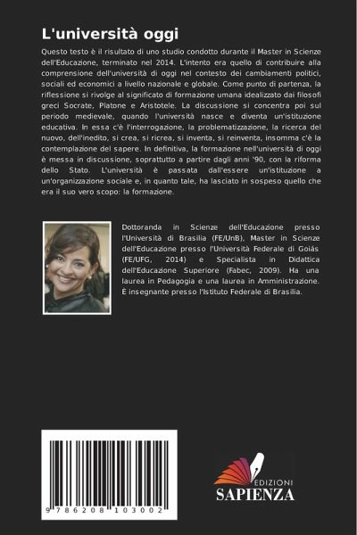 Questo testo è il risultato di uno studio condotto durante il Master in Scienze dell'Educazione, terminato nel 2014. L'intento era quello di contribuire alla comprensione dell'università di oggi nel contesto dei cambiamenti politici, sociali ed economici a livello nazionale e globale. Come punto di partenza, la riflessione si rivolge al significato di formazione umana idealizzato dai filosofi greci Socrate, Platone e Aristotele. La discussione si concentra poi sul periodo medievale, quando l'università nasce e diventa un'istituzione educativa. In essa c'è l'interrogazione, la problematizzazione, la ricerca del nuovo, dell'inedito, si crea, si ricrea, si inventa, si reinventa, insomma c'è la contemplazione del sapere. In definitiva, la formazione nell'università di oggi è messa in discussione, soprattutto a partire dagli anni '90, con la riforma dello Stato. L'università è passata dall'essere un'istituzione a un'organizzazione sociale e, in quanto tale, ha lasciato in sospeso quello che era il suo vero scopo: la formazione.