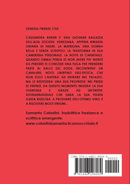 VENEZIA-FIRENZE 1755 CASSANDRA RENIER E' UNA RAGAZZA DELL'ALTA SOCIETA' VENEZIANA, APPENA RIMASTA ORFANA DI PADRE. LA MATRIGNA, DONNA BELLA E SENZA SCRUPOLI, LA TRASFORMA IN SUA CAMERIERA PERSONALE. LA NOTTE DI CARNEVALE, QUANDO ORMAI PENSA DI NON AVERE PIU' NIENTE DA PERDERE SI CONCEDE UNA FUGA PER PRENDERE PARTE AL BALLO DEL DOGE. INCONTRERA' UN CAVALIERE, NOTO LIBERTINO DELL'EPOCA, CHE NON SOLO L'AIUTERA' AD ENTRARE NEL PALAZZO, MA LE RESTITUERA' UNA SUA PROPRIETA' NEI PRESSI DI FIRENZE. DA QUESTO MOMENTO INIZIERA' LA SUA AVVENTURA E GRAZIE AD UN'ENTITA' SOVRANNATURALE, CHE SARA' LA SUA FIDATA GUIDA, RIUSCIRA' A PRODURRE DELL'OTTIMO VINO E A RISOLVERE MOLTI ENIGMI... -------------------------------------------------- ACQUISTANDO O SCARICANDO QUESTO ROMANZO DONERETE 50 CENTESIMI ALL'ASSOCIAZIONE IHP PER LA SALVEZZA E LA CURA DI TUTTI GLI EQUINI MALTRATTATI www.horseprotection.it GRAZIE! www.catastinisamanta.ilcannocchiale.it