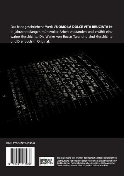 Das handgeschriebene Werk L'uomo La Dolce Vita Bruciata ist in jahrzehntelanger, mühevoller Arbeit entstanden und erzählt eine wahre Geschichte. Die Werke von Rocco Tarantino sind Geschichte und Drehbuch im Original.