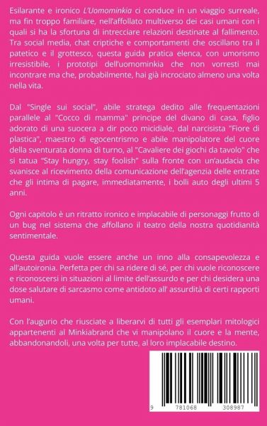 Sei mai rimasta incastrata in una conversazione senza via d'uscita con un esemplare di Uomominkia? Hai mai assistito al suo misterioso rituale di accoppiamento fatto di flexate su Instagram, monologhi sul suo rapporto di coppia andato in frantumi, lodi allo stinco di maiale cucinato dalla madre perfetta, ovviamente la sua, citazioni a caso di poeti fuori contesto mentre ti giura amore eterno dopo tre vocali su WhatsApp? Se la risposta è sì, questo è il manuale di dribbling che fa per te. Con un'approfondita analisi più fanta che scientifica del Minkianbrand, questo libro ti condurrà tra le sottospecie più diffuse di Uomominkia: dal machiavellominkia che, da esperto disagiato, crede di poter manipolare il mondo con aforismi copiati da TikTok all'accattoneminkia, che sogna la bella vita ma coi soldi degli altri. Senza dimenticare il cavaliereminkia che apre la portiera solo se c'è un pubblico femminile da impressionare e il temibile psycominkia, un maestro del ritorno sul luogo del delitto, che confessa amore eterno a tutte quelle che conosce su Instagram. Con una dose letale di ironia e realismo, questa rassegna dei casi umani ti aiuterà a riconoscere le creature mitologiche di Minkiolandia, compatirle e, soprattutto, evitarle con agilità. Una guida essenziale per navigare il mondo contemporaneo senza farsi risucchiare nel vortice dell'inutilità esistenziale targata Uomominkia. Adatto a chi ha senso dell'umorismo, a chi non è permaloso e a chi ha un disperato bisogno di farsi una risata.
