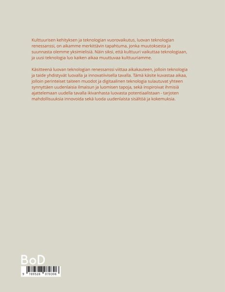 Kulttuurisen kehityksen ja teknologian vuorovaikutus, luovan teknologian renessanssi, on aikamme merkittävin tapahtuma, jonka muutoksesta ja suunnasta olemme yksimielisiä. Näin siksi, että kulttuuri vaikuttaa teknologiaan, ja uusi teknologia luo kaiken aikaa muuttuvaa kulttuuriamme. Samalla vanhan kulttuuriperinnön säilyttäminen ja jakaminen sekä uuden syntyminen ovat yhdistäviä ja yhteisiä haasteitamme. Kulttuurinen kehitys teknologian valossa kuvaa sitä, miten teknologian käyttö ja kehittyminen vaikuttavat kulttuurisiin käytäntöihin, arvoihin ja ilmaisumuotoihin yhteiskunnassa. Käsitteenä luovan teknologian renessanssi viittaa aikakauteen, jolloin teknologia ja taide yhdistyvät luovalla ja innovatiivisella tavalla. Tämä käsite kuvastaa aikaa, jolloin perinteiset taiteen muodot ja digitaalinen teknologia sulautuvat yhteen synnyttäen uudenlaisia ilmaisun ja luomisen tapoja, sekä inspiroivat ihmisiä ajattelemaan uudella tavalla ikivanhasta luovasta potentiaalistaan - tarjoten mahdollisuuksia innovoida sekä luoda uudenlaista sisältöä ja kokemuksia.