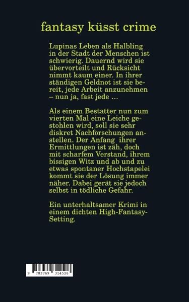 Halblinge haben es schwer unter Menschen. Lupina ist ein Halbling und lebt in Garbath, einer Handels- und Hafenstadt der Menschen. Hier muss sie sich zwischen Huren, Händlern und Halunken über Wasser halten. Stets ist sie in Geldnot und nimmt jede Arbeit an, die sie finden kann. Nun ja ..., fast jede. Als einem Bestatter zum vierten Mal eine Leiche gestohlen wird, soll Lupina Ermittlungen anstellen, aber bitte ganz diskret. So wird sie ganz unverhofft zur Detektivin. Mit Einfallsreichtum, bissigem Witz und spontaner Hochstapelei kommt sie der Lösung des Falls immer näher. Doch während sie dem Täter auf die Schliche kommt, begibt sie sich selbst in tödliche Gefahr. Ein Krimi, ebenso spannend wie heiter, im dichten Setting von epischer High Fantasy.