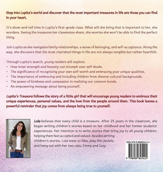 Step into Lupita's world and discover that the most important treasures in life are the ones you can find in your heart. It's show-and-tell time in Lupita's first-grade class. What will she bring that is important to her, she wonders. Seeing the treasures her classmates share, she worries that she won't be able to find the perfect thing. Join Lupita as she navigates family relationships, a sense of belonging, and self-acceptance. Along the way, she discovers that the most cherished things in life are not always tangible but rather heartfelt. Through Lupita's search, young readers will explore: ¿ How inner strength and bravery can triumph over self-doubt. ¿ The significance of recognizing your own self-worth and embracing your unique qualities. ¿ The importance of embracing and including children from diverse cultural backgrounds. ¿ The power of kindness and compassion in realizing our common bonds. ¿ An empowering message about being yourself. Lupita's Treasure follows a wonderful story of a little girl that will encourage young readers to embrace their unique experiences, personal values, and the love from the people around them. This book leaves a powerful reminder that joy comes from being always true to yourself. Get a copy now!