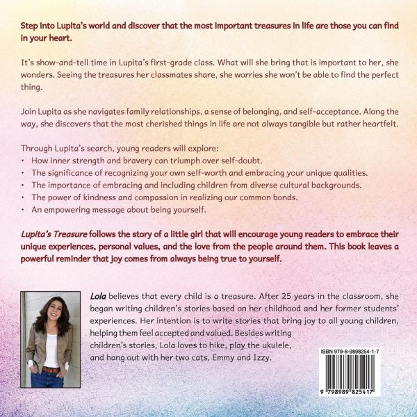 Step into Lupita's world and discover that the most important treasures in life are the ones you can find in your heart. It's show-and-tell time in Lupita's first-grade class. What will she bring that is important to her, she wonders. Seeing the treasures her classmates share, she worries that she won't be able to find the perfect thing. Join Lupita as she navigates family relationships, a sense of belonging, and self-acceptance. Along the way, she discovers that the most cherished things in life are not always tangible but rather heartfelt. Through Lupita's search, young readers will explore: ¿ How inner strength and bravery can triumph over self-doubt. ¿ The significance of recognizing your own self-worth and embracing your unique qualities. ¿ The importance of embracing and including children from diverse cultural backgrounds. ¿ The power of kindness and compassion in realizing our common bonds. ¿ An empowering message about being yourself. Lupita's Treasure follows a wonderful story of a little girl that will encourage young readers to embrace their unique experiences, personal values, and the love from the people around them. This book leaves a powerful reminder that joy comes from being always true to yourself. Get a copy now!