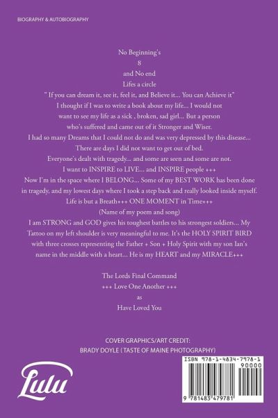 No Beginning's 8 and No end Lifes a circle " If you can dream it, see it, feel it, and Believe it... You can Achieve it" I thought if I was to write a book about my life... I would not want to see my life as a sick , broken, sad girl... But a person who's suffered and came out of it Stronger and Wiser. I had so many Dreams that I could not do and was very depressed by this disease... There are days I did not want to get out of bed. Everyone's dealt with tragedy... and some are seen and some are not. I want to INSPIRE to LIVE... and INSPIRE people +++ Now I'm in the space where I BELONG... Some of my BEST WORK has been done in tragedy, and my lowest days where I took a step back and really looked inside myself. Life is but a Breath+++ ONE MOMENT in Time+++ I have a son named Ian. He is my HEART and my MIRACLE+++ The Lords Final Command +++ Love One Another +++ as Have Loved You