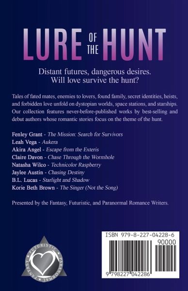 Distant futures, dangerous desires. Will love survive the hunt? The Fantasy, Futuristic, and Paranormal Romance Writers invite you to join us on adventures across the stars in LURE OF THE HUNT, a science-fiction romance anthology. Tales of fated mates, enemies to lovers, found family, secret identities, heists, and forbidden love unfold on dystopian worlds, space stations, and starships. Our collection features never-before-published works from best-selling and debut authors whose romantic stories focus on the theme of the hunt. By Claire Davon - Chase Through the Wormhole She has a high bounty on her head. But one hunter desires a much different prize... By Jaylee Austin - Chasing Destiny Love, technology, and destiny collide in this futuristic cyborg romance. Will trust and loyalty prevail in a world of deception and danger? By Fenley Grant - The Mission: Search for Survivors She prepared for every aspect of her mission to find humanity's survivors...except for falling in love. By Akira Angel - Escape from the Exteris As their world falls apart, a tale of sacrifice and survival takes flight, with two souls charting a course into the unknown. By B.L. Lucas - Starlight and Shadow On the run from a dark military order, a woman with extraordinary tech powers and a man whose memories have been erased by the same enemy struggle to trust each other and the mysterious bond they share. By Korie Beth Brown - The Singer (Not the Song) Of all the dive bars in the universe, he chose this one.... By Natasha Wilco - Technicolor Raspberry Of all the hitchhiking androids this side of the Milky Way, she had to pick up the one with wartime secrets...and a cute processor. By Leah Vega - Aukera Choosing your eternal mate is a gift from the gods, but the consequences could be deadly. These stories and more await you in LURE OF THE HUNT whether you're looking for enemies-to-lovers, second chances, or a dash of interstellar mystery, this anthology delivers unforgettable romances set against the stars. Don't miss your chance to explore new worlds and experience the allure of the hunt. Love, danger, and destiny are just a heartbeat away in this anthology proudly sponsored by the Fantasy, Futuristic, and Paranormal Romance Writers chapter.