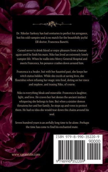 Dr. Nikolav Sarkozy has had centuries to perfect his arrogance, but his cold vampire soul is no match for the beautifully joyful ER doctor, Francesca Banetti. Cursed never to drink blood or enjoy pleasure from a human again until he finds his mate, Niko has lived an extremely lonely vampire life. When he walks into Mercy General Hospital and meets Francesca, his penance crashes down around him. Francesca is a healer, but with her haunted past, she keeps her witch status hidden. While she excels at saving lives, she flourishes when infusing her magic into food, doting on her niece and nephew, and teasing Niko, of course. Niko is everything bleak and miserable. Francesca is laughter, light, and love. He craves her but denies the ancient instinct whispering she belongs to him. But when a sinister demon threatens her and her family, he steps up and vows to protect them. He had no idea she would tear down the chains around his soul. Seven hundred years is an awfully long time to be alone. Perhaps the time has come to find his enchanted mate. CW: Talk of death and killing. Past death of parents and grief. Death of patients in hospital, including child. Demon targeting women. Talk of gruesome attacks by demon.