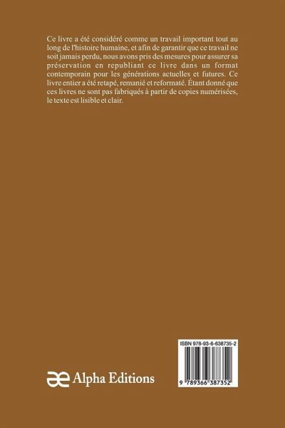 L'Uscoque" est un livre classique, qui a eu une valeur significative tout au long de l'histoire, et pour garantir que sa sagesse intemporelle ne soit jamais perdue, Alpha Editions l'a soigneusement préservé en le republiant dans un format moderne et accessible aux générations présentes et futures. Soigneusement reformaté, retapé , et nouvellement conçue, cette édition offre un texte clair et lisible, sans copies numérisées de l'uvre originale, Alpha Editions se consacre à insuffler une nouvelle vie aux livres anciens et classiques, rendant ces trésors littéraires à nouveau disponibles pour les lecteurs qui chérissent l'histoire. culture et savoir intemporel.