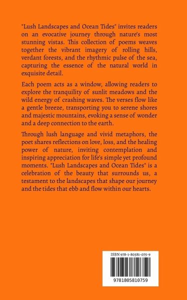 "Lush Landscapes and Ocean Tides" invites readers on an evocative journey through nature's most stunning vistas. This collection of poems weaves together the vibrant imagery of rolling hills, verdant forests, and the rhythmic pulse of the sea, capturing the essence of the natural world in exquisite detail. Each poem acts as a window, allowing readers to explore the tranquility of sunlit meadows and the wild energy of crashing waves. The verses flow like a gentle breeze, transporting you to serene shores and majestic mountains, evoking a sense of wonder and a deep connection to the earth. Through lush language and vivid metaphors, the poet shares reflections on love, loss, and the healing power of nature, inviting contemplation and inspiring appreciation for life's simple yet profound moments. "Lush Landscapes and Ocean Tides" is a celebration of the beauty that surrounds us, a testament to the landscapes that shape our journey and the tides that ebb and flow within our hearts.