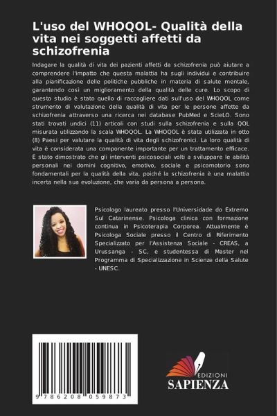 Indagare la qualità di vita dei pazienti affetti da schizofrenia può aiutare a comprendere l'impatto che questa malattia ha sugli individui e contribuire alla pianificazione delle politiche pubbliche in materia di salute mentale, garantendo così un miglioramento della qualità delle cure. Lo scopo di questo studio è stato quello di raccogliere dati sull'uso del WHOQOL come strumento di valutazione della qualità di vita per le persone affette da schizofrenia attraverso una ricerca nei database PubMed e ScieLO. Sono stati trovati undici (11) articoli con studi sulla schizofrenia e sulla QOL misurata utilizzando la scala WHOQOL. La WHOQOL è stata utilizzata in otto (8) Paesi per valutare la qualità di vita degli schizofrenici. La loro qualità di vita è considerata una componente importante per un trattamento efficace. È stato dimostrato che gli interventi psicosociali volti a sviluppare le abilità personali nei domini cognitivo, emotivo, sociale e psicomotorio sono fondamentali per la qualità della vita, poiché la schizofrenia è una malattia incerta nella sua evoluzione, che varia da persona a persona.