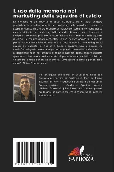 La memoria è un importante asset strategico ed è stata utilizzata gradualmente e indirettamente nel marketing delle squadre di calcio. Lo scopo di questo libro è stato quello di individuare come la memoria possa essere utilizzata nel marketing delle squadre di calcio, visto il ruolo che svolge e il potenziale presente e futuro dell'uso della memoria nelle squadre di calcio. Le considerazioni presentate in questo libro aprono la possibilità per le società calcistiche di orientare le proprie azioni di marketing verso aspetti del passato, al fine di sviluppare prodotti, beni e servizi che soddisfino adeguatamente le esigenze dei propri consumatori e che servano a identificare cosa del passato e come il passato debba essere elogiato quando si rilanciano azioni ancorate al passato delle società calcistiche. ¿Ricordare è facile per chi ha memoria. Dimenticare è difficile per chi ha il cuore¿. William Shakespeare