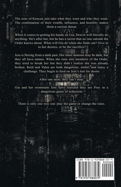 The sons of Kenyan just take what they want and who they want. The combination of their wealth, influence, and hostility makes them a serious threat. When it comes to getting his hands on Gia, Dravin will literally do anything. He's after her, but he has a secret that no one outside the Order knows about. What will Gia do when she finds out? Give in to her desires, or be the sacrifice? Jess is fleeing from a dark past. Her inner demons may be dark, but they all have names. When she runs into members of the Order, they tried to break her but they didn't realize she was already broken. Reid and Valen are both dangerous, sinful, and enjoy a challenge. They begin to feed on Jess's lust for desire. After one taste, they can't stop. Gia and her roommate Jess have realized they are Prey in a dangerous game of seduction. There is only one way out: play the game or change the rules. *** Lust is book 2 from The Prey Series. You must read Thirst before reading Lust. This is a dark college romance and is intended for readers who are 18+. Please read the Trigger Warning. Gothic Romance Multiple POV's