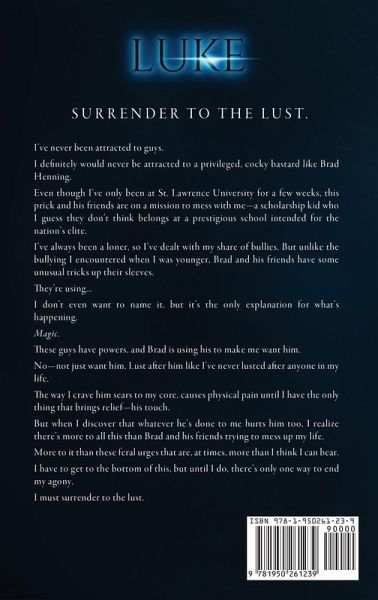 LUKE I've never been attracted to guys. I definitely would never be attracted to a privileged, cocky bastard like Brad Henning. Even though I've only been at St. Lawrence University for a few weeks, this prick and his friends are on a mission to mess with me-a scholarship kid who I guess they don't think belongs at a prestigious school intended for the nation's elite. I've always been a loner, so I've dealt with my share of bullies. But unlike the bullying I encountered when I was younger, Brad and his friends have some unusual tricks up their sleeves. They're using... I don't even want to name it, but it's the only explanation for what's happening. Magic. These guys have powers, and Brad is using his to make me want him. No-not just want him. Lust after him like I've never lusted after anyone in my life. The way I crave him sears to my core, causes physical pain until I have the only thing that brings relief-his touch. But when I discover that whatever he's done to me hurts him too, I realize there's more to all this than Brad and his friends trying to mess up my life. More to it than these feral urges that are, at times, more than I think I can bear. I have to get to the bottom of this, but until I do, there's only one way to end my agony. I must surrender to the lust.