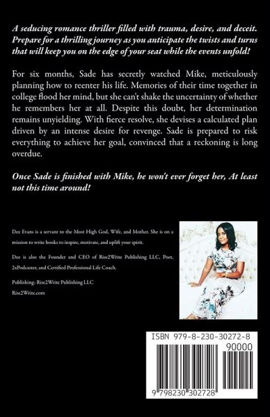A seducing romance thriller filled with trauma, desire, and deceit. Prepare for a thrilling journey as you anticipate the twists and turns that will keep you on the edge of your seat while the events unfold! For six months, Sade has secretly watched Mike, meticulously planning how to reenter his life. Memories of their time together in college flood her mind, but she can't shake the uncertainty of whether he remembers her at all. Despite this doubt, her determination remains unyielding. With fierce resolve, she devises a calculated plan driven by an intense desire for revenge. Sade is prepared to risk everything to achieve her goal, convinced that a reckoning is long overdue. Once Sade is finished with Mike, he won't ever forget her, At least not this time around!
