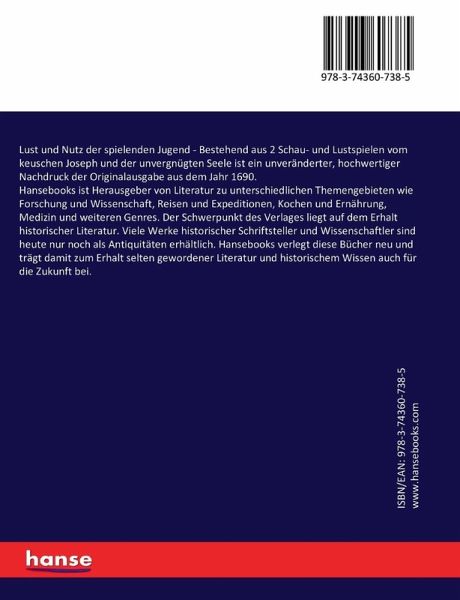 Lust und Nutz der spielenden Jugend - Bestehend aus 2 Schau- und Lustspielen vom keuschen Joseph und der unvergnügten Seele ist ein unveränderter, hochwertiger Nachdruck der Originalausgabe aus dem Jahr 1690.